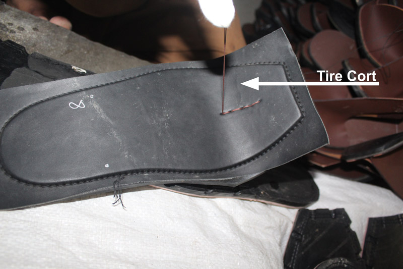 We look for used product to recycle in our shoes as much as possible, therefore, the Tire Cord that is taken out from tires, is used for sewing shoes.